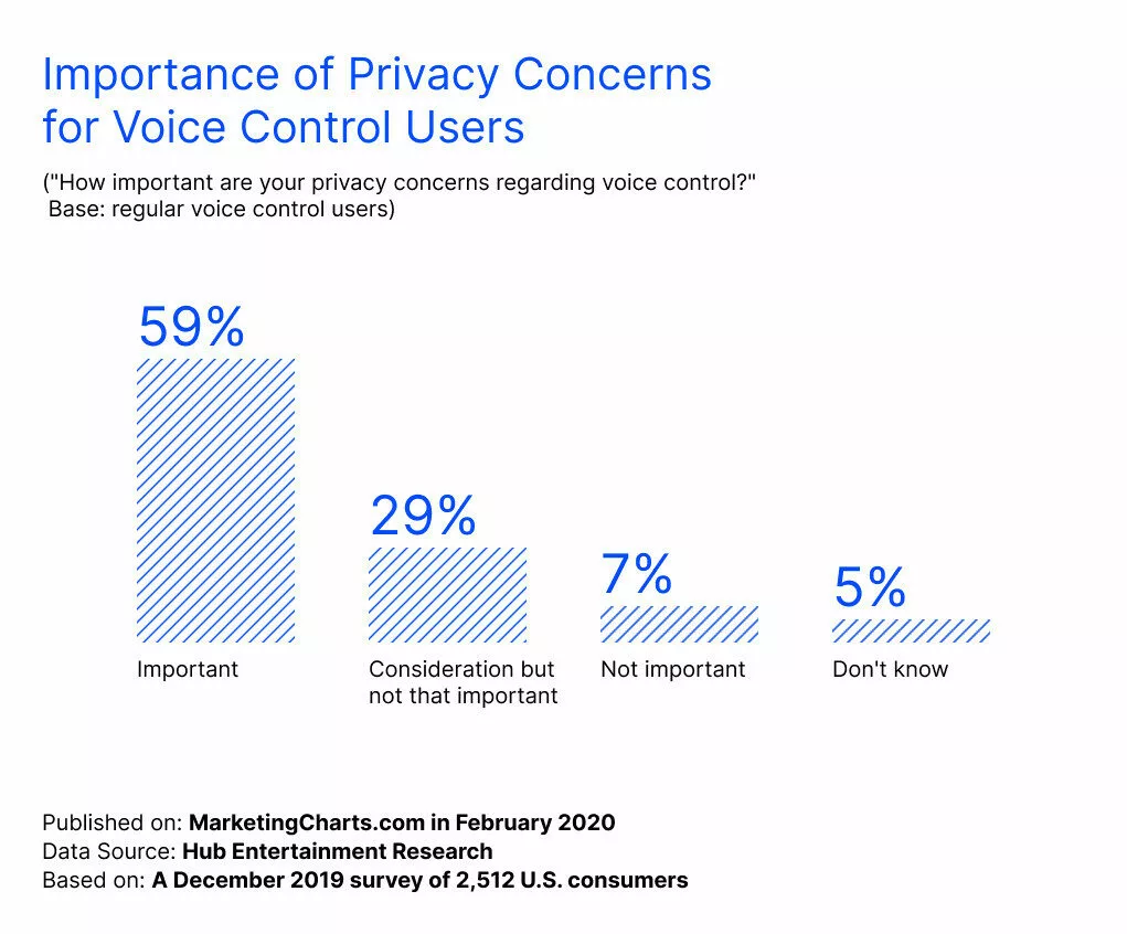 Research shows that worldwide, 45% of smart speaker users are concerned about voice data privacy, and 42% worry about voice data hacking. In another survey, 59% of respondents said privacy is an important factor when using voice control devices.